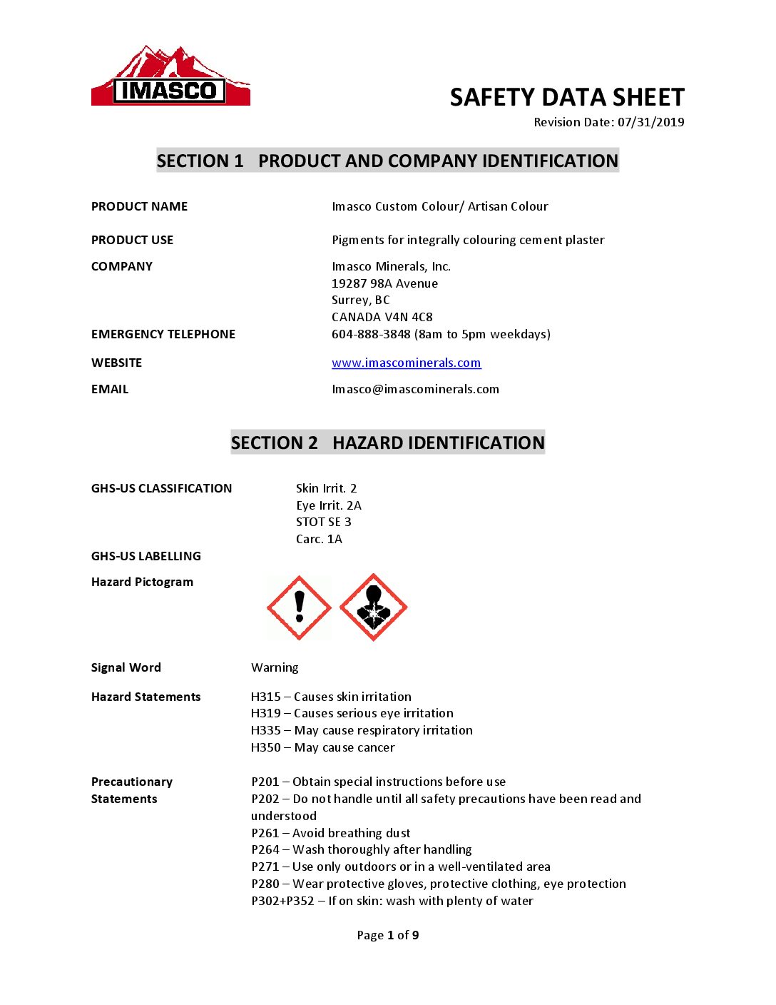 The Safety Data Sheet (SDS) for Imasco Custom Colour / Artisan Colour provides safety, handling, and hazard information for pigments used to integrally colour cement plaster and stucco products. The document outlines the product’s intended use in colouring cement-based finishes.